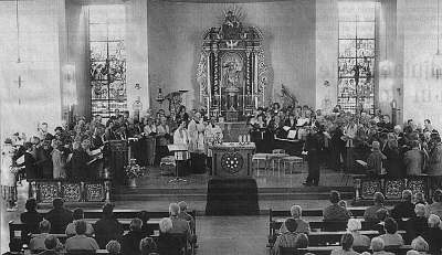 Pastor Udo Maria Schiffers bezeichnete in seiner Begrüßung die Chöre als das Mark der Gemeinden; nicht zuletzt sie motivierten durch ihre Darbietungen die Gemeinden, die Gottesdienste zu besuchen. Verschmolzen zu einem großen Chor trugen die Sänger Werke wie die Motette „Cantate Domino" von Hans Leo Hassler , das Kyrie „Ruf aus Taize" mit der Musik von Ja-ques Berthier oder „Gott hat mir längst einen Engel gesandt" nach Josef Knapp vor.