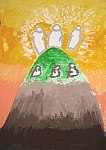 Auf unserem Hungertuch sehen wir heute den Berg Tabor, auf dem dieses Ereignis stattgefunden haben soll. Die unteren Regionen des Berges sind in dunklen Farben gehalten. Nach oben wird es immer heller bis zur Bergspitze, die in