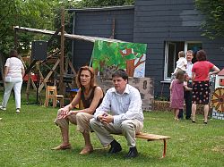 Im Namen des Elternrates lud Gabriele Knoth alle Anwesenden zu dem sich anschließenden Fest mit vielen Überraschungen ein. Die Kinder konnten sich an verschiedenen Ständen in mittelalterlichen Handwerken üben, so z.B. im Schnitzen, im Kerzenziehen oder Töpfern. Sie konnten Lederarmbändchen herstellen oder beim Spinnen zuschauen. Viele hatten auch sichtlich Spaß daran, geschminkt zu werden, mit Dosen zu werfen oder Luftballons mit Rückantwortkarten steigen zu lassen. Auch für einen kulinarischen Hochgenuß war im Eingangsbereich des Kindergartengebäudes gesorgt, hier konnten Groß und Klein ihren Gaumen verwöhnen lassen oder ihren Durst löschen. Einige Eltern fanden es sehr angenehm , dass für die Allerkleinsten mit dem Sandkasten ein eigenes abgetrenntes Gebiet geschaffen worden war, in dem sie in Ruhe spielen konnten.