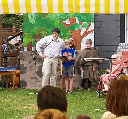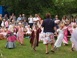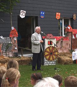 Nach der heiligen Messe versammelten sich alle auf der Pfadfinderwiese, wo Herr Profitlich, der Leiter des Kindergartens, unter allen Gästen besonders den stellvertretenden Vorsitzenden des Kirchenvorstandes, Herrn Tewes und den stellvertretenden Bürgermeister der Stadt Königswinter, Herrn Sokrates Theodoridis, begrüßte. Es freute ihn besonders, allen mitteilen zu können, dass die Betreibung der Spielgruppe für ein weiteres Jahr gesichert ist. Die Spielgruppe, die heute in dem Gebäude untergebracht ist, in dem die Zeit des Katholischen Kindergartens 1945 begann. Die Beschäftigung mit der Geschichte führte an diesem Tag aber nicht nur in die nahe Vergangenheit, sondern einige Jahrhunderte weiter zurück in das Mittelalter. Aufgefallen war schon eine von Wesna Blesgen wunderschön gemalte Kulisse eines mittelalterlichen Marktplatzes und einige Kinder in Kostümen aus der Zeit der Ritter und Burgfräulein. Die Sitten und Gebräuche aus dieser Zeit wurden den Zuschauern und Zuhörern nahegebracht durch ein Singspiel, an dem alle Kindergarten- und Spielgruppenkinder beteiligt waren. Da gab es mittelalterliche Tänze, Lieder, die auch heute noch bekannt sind, Gaukler, Akrobaten und Tierbändiger und ein wunderschönes Liebeslied von einem kleinen Paar sogar in Mittelhochdeutsch gesungen. Drei ehemalige Kindergartenkinder Isabelle, Marian und Joshua führten die Besucher durch das Singspiel, musikalisch begleitet von Herrn Profitlich auf dem Keyboard, Herrn Lehnberg auf der Gitarre, Frau Günzel auf der Geige, Matthias Günzel auf der Trompete und Marina Günzel auf der Flöte. Im Anschluß wurden viele Glückwünsche überbracht und Geschenke übergeben. So hatte der Kirchenvorstand als äußeres Zeichen der Verbundenheit der Einrichtung einen Ahornbaum geschenkt, die Katholische Grundschule symbolisch einen Apfelkorb übergeben mit einem Gutschein für ein Apfelbäumchen, das im Herbst gepflanzt werden soll. Von der Elterninitiative „Villa Kunterbunt“ wurde Herrn Profitlich für den Kindergarten ein Spiel überreicht. Die Einrichtung konnte sich über viele Sach- und Geldspenden aus der Elternschaft und den Gemeinschaften des Ortes freuen. Hervorzuheben ist der Betrag von 500,- €, der von der Sparkasse in Ittenbach zur Verfügung gestellt wurde.