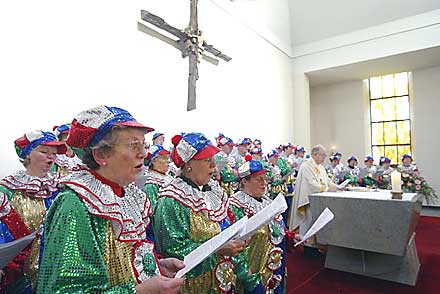 Auch eines der wichtigsten Elemente des Karnevals, das Lachen, kam nicht zu kurz. Der Kirchenchor Sankt Joseph ließ es sich im 40. Jahr seines Bestehen nicht nehmen, den musikalischen Teil der Messe zu gestalten. Chorleiter Edgar Zens hatte gleich mehrere Gelegenheiten, der Orgel einen Tusch zu entlocken. Die närrischen Regenten aus dem Umland verliehen der Messfeier mit ihren prunkvollen Kostümen und bunten Gefolgen den angemessenen Glanz.