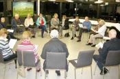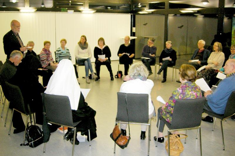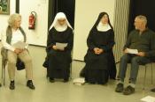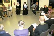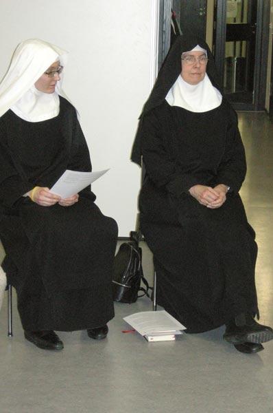 Es ist nicht alltäglich, eine echte Benediktinerin bei sich zu haben. Wir hatten gleich zwei bei uns, denn Schwester Lioba, die wir von der Glaubensbildung aus für einen Vortrag gewinnen konnte, brachte gleich noch eine jüngere Mitschwester aus dem Kölner Kloster der Benediktinerinnen mit nach Stieldorf und hielt uns in eindrucksvoller Weise eine, wie sie es nannte "Spirituelle Exegese zu Mt.14" mit dem Titel" Ein Tag Leben des Herrn". Dabei hielt sie nicht nur einen Vortrag, sondern bezog immer wieder die interessierte Hörerschaft mit ein.