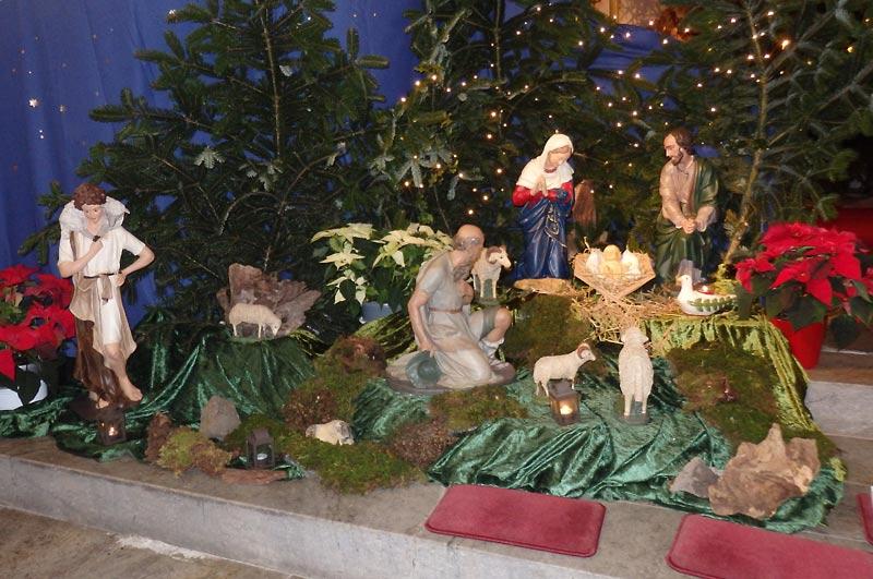 Auch in diesem Jahr steht die Krippe mit den alten Gipsfiguren , die vor einigen Jahren restauriert wurden, wieder an der linken Seite vor dem Altarraum. Marianne Ramscheid hat sie wieder liebevoll mit Pflanzen und anderer Dekoration geschmückt. Ein Besuch lohnt sich.