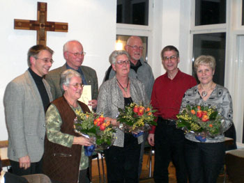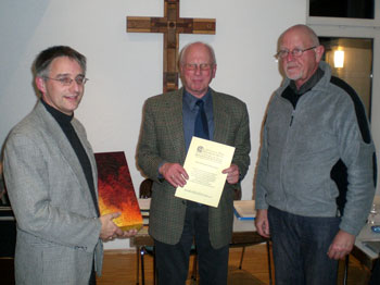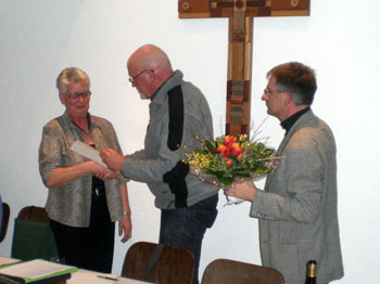![]() 1957 – wir befinden uns mitten im Wirtschaftswunder. Der gestiegene Kraftfahrzeugverkehr erfordert es, dass die Höchstgeschwindigkeit innerorts auf 50 Stundenkilometer begrenzt wird. Das Saarland wird zehntes Bundesland der Bundesrepublik Deutschland. Die Sowjetunion schießt den Satteliten Sputnik ins Weltall und schockt damit die Amerikaner. Am New Yorker Winter Garden Theatre wird das Musical West Side Story von Leonard Bernstein uraufgeführt. Auf einem Kirchenfest in Liverpool begegnen sich zum ersten Mal John Lennon und Paul McCartney. Ebenfalls eine Begegnung mit enormer Wirkung gibt es für den Kirchenchor Heisterbacherrott: Rudi Steiner beginnt sein nunmehr 50-jähriges Wirken für die Musica sacra. Die Verdienste von Rudi Steiner um die Pfarrgemeinde aufzuzählen wäre abendfüllend. Jahrzehntelang im Kirchenvorstand, jahrzehntelang Rendant und so weiter und so fort. Im Chor hatte Rudi Steiner gute zwanzig Jahre – von 1971 bis 1991 – das Amt des 1. Vorsitzenden inne. Zahlreiche Fahrten und ein lebendiger Chorkarneval prägten das gesellige Leben in dieser Zeit. Vorher war er natürlich auch schon im Vorstand, als Schriftführer und 2. Vorsitzender. Wenn man seine Beziehung zum Chor mit einem Wort umschreiben müsste, so wäre sicher die Vokabel „Verlässlichkeit“ am treffendsten. Außer zu Urlaubszeiten ist Rudi eigentlich immer da: bei den Proben, in den Messen und Gottesdiensten und bei den anderen Anlässen des Chores. Jüngstes Beispiel: das Knällchenessen im Einkehrhaus, wo er – seine Frau natürlich, denn für sie gilt das hier Gesagte auch – es trotz eines anderen Termins noch möglich machte, dabei sein. Lieber Rudi, herzlichen Dank für das halbe Jahrhundert Treue zum Kirchenchor. Diese Verbindung ist wirklich Gold wert. Es ist schon so etwas wie eine „goldene Hochzeit mit dem Chor“. Zum Ausdruck bringen das die goldene Ehrennadel und die Urkunde des Diözesan-Cäcilienverbandes, zu dem übrigens 1900 kirchenmusikalische Gruppen mit 45.000 Mitgliedern zählen. Rudi, bleibe der Cäcilia noch lange erhalten! |