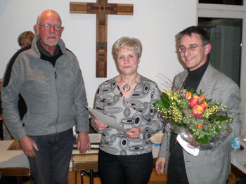 ![]() Wir gehen noch einmal fünf Jahre zurück: 1967. Sechs-Tage-Krieg zwischen Israel und seinen arabischen Nachbarn. In Deutschland wird das Farbfernsehen eingeführt. Das legendäre Album „Sergeant Pepper‘s Lonly Hearts Club Band“ der Beatles erscheint. In der DDR wird ein Mindesturlaub von 15 Tagen festgelegt. Das ist auch die Kurve zu unserer jetzigen Jubilarin. In der ehemaligen DDR liegt nämlich das Eichsfeld, und von dort stammt Ilona Steiner, die seit nunmehr 40 Jahren ihre Stimme zum Lobe Gottes erschallen lässt. Seit Jahrzehnten hat sie sich für die Pfarrgemeinde und im Dorfsleben eingebracht, unter anderem im Pfarrgemeinderat, in der Frauengemeinschaft und im Seniorenkreis Heisterbacherrott. Im Chor war sie lange Jahre im Vorstand aktiv, und noch heute ist ihre Anhänglichkeit zu unserem Ehrenvorsitzenden zu spüren. In 40 Jahren hat sich auch in der Kirche vieles gewandelt, und deswegen gilt bei solchen Jubiläen immer das Wort des katholischen Gesellenvaters Adolf Kolping: „Anfangen ist oft das Schwerste, treu bleiben aber das Beste!“ Liebe Ilona, dir herzlichen Dank für deine Treue zur Cäcilia, sichtbar in der Urkunde des Diözesan-Cäcilienverbandes und der goldenen Ehrennadel. |